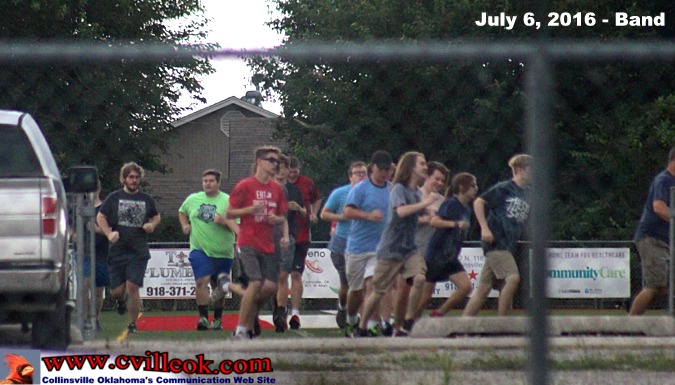 | Yes, the Collinsville Crimson Cadet Band members also workout to get in shape for their marching season. I caught a photo (from the road) of a lap around Sallee Field last Wednesday (July 6th) ... again with an outdoor practice shortened by rain. Doesn't seem like a "normal" July weather pattern? ... but I do have green grass in my yard. -- Ted |