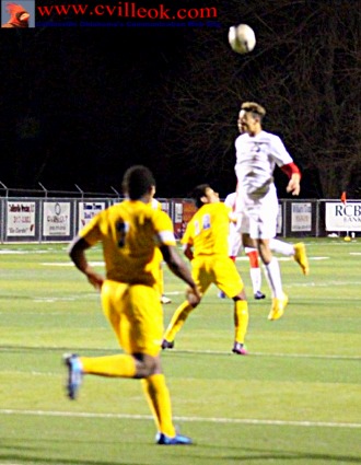 | The 3-photo sequence above shows a corner kick by Tyler Rairdon (from the right) causing a scramble in front of the net ... then Freddy Olmos (#9) sending it back to the right ... for a Chase McColley (#20) header goal at 18:14 of the first half to tie the score at 1-1. | |||||||