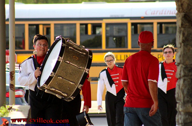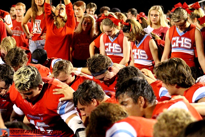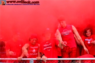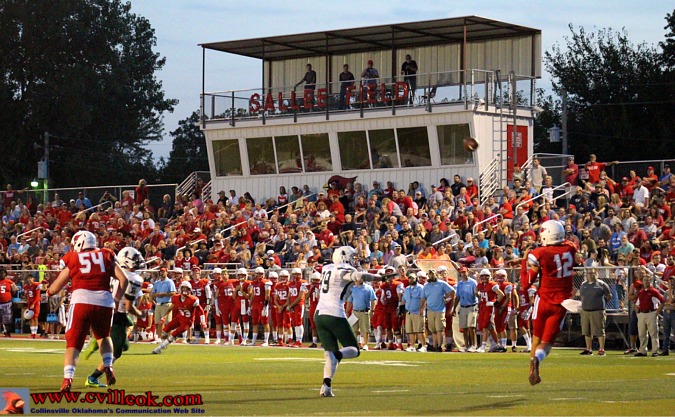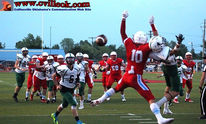 | Brett Erickson (#11) picked off a long Catoosa pass and returned it to the Collinsville 48 with 2:22 left in the first quarter with The Trap and cheerleaders and Tre Robinson (#75) cheering him on. Brett was whistled down on this hit but he popped up and tried to continue convinced he wasn't downed. | ||||||||||||||||||||||||||||