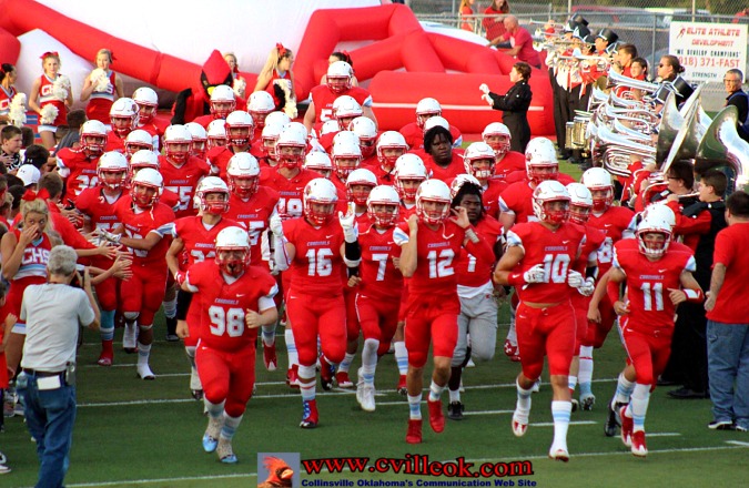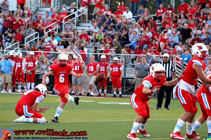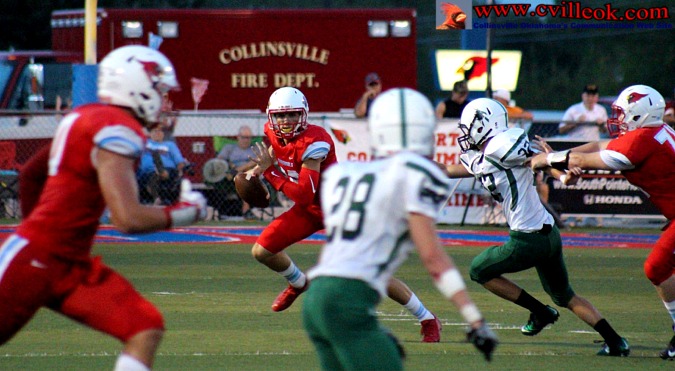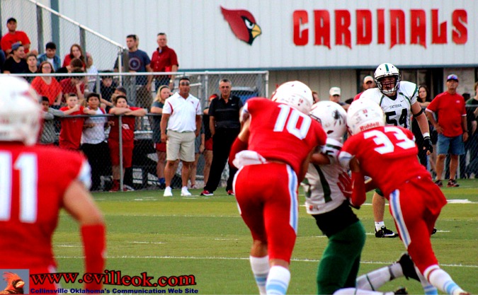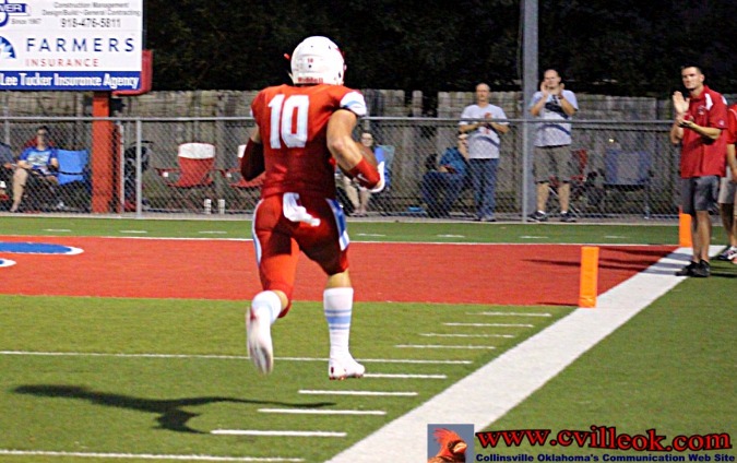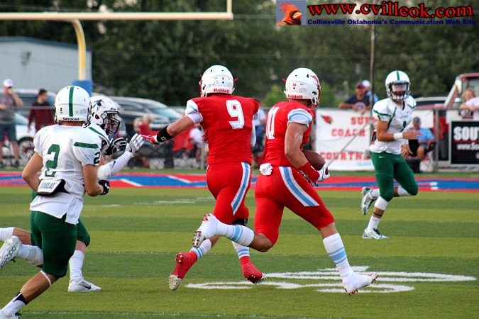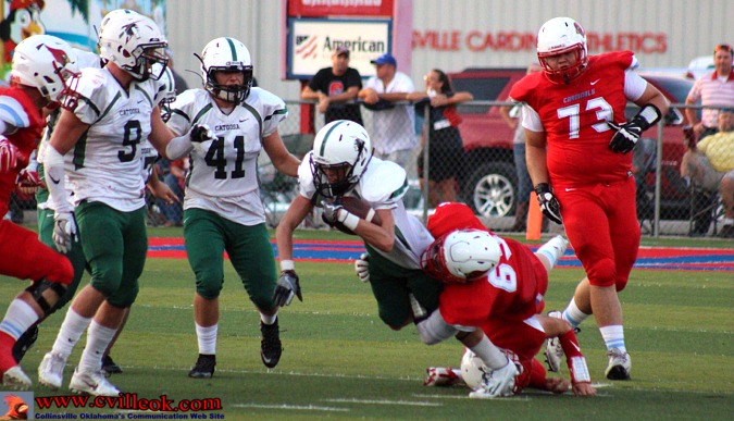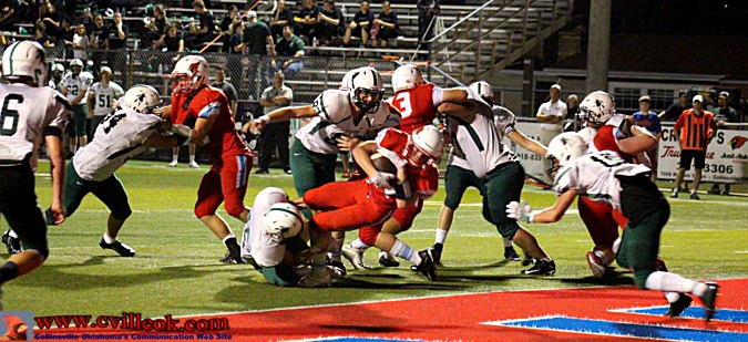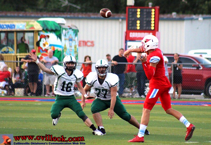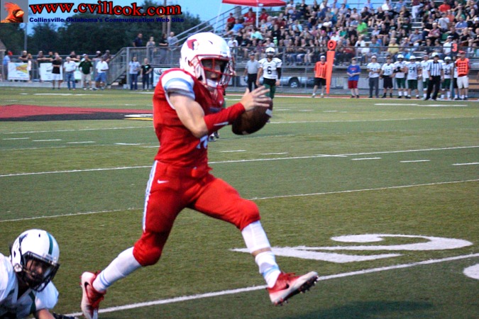 | After being pinned at the 1 yard line by a Catoosa punt with 3:55 left in the second quarter, Catoosa nearly got a 2-point safety with Logan Sieminskie getting just a few inches out of the endzone on the first play. Collinsville then covered 99+ yards with this pass play from Seth Boomer (#12) to Dylan Russell (#3) reaching the Card's 39 setting up the play below. | ||||||||||||||||||||||||||||