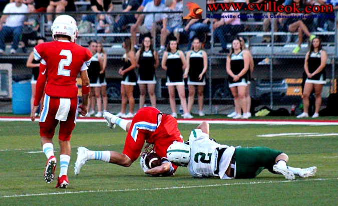 | Levi Draper (#10) & Hayden West (#33) double teamed this Catoosa pass receiver and Levi ended up the ball and returned it for the first score of the game. The Catoosa pass play started at the Catoosa 31 yard line. | ||||||||||||||||||||||||||||