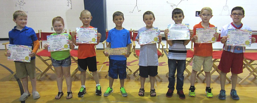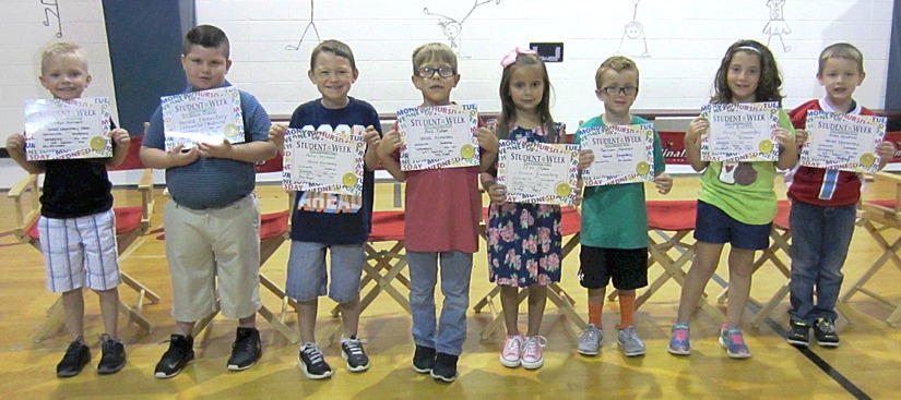 | First Grade Good Sportsmanship Students (9/16/2016) -- (l-r) Landyn Stierwalt, Blazze Davis, Parker Strickland, Arik Fisher, Ellee Myers, Harrison Marshall, Tori Burton, and Aiden Bradfield | |||
