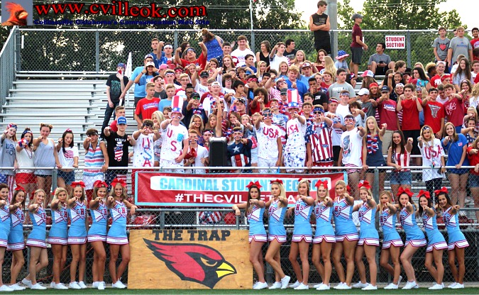 | Walker Roberts (#23) runs by "The Trap" student section on his way to the endzone with a "pick 6" just a few plays after Burd's TD. Roberts picked off the East Central pass and scored with 10 minutes left in the second quarter. Seth Weiser's extra point kick was good and the score 13-0. | |||||||||||||||||||