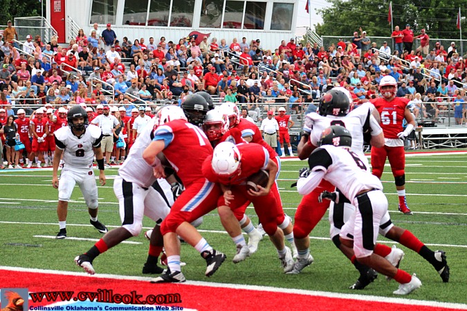 | Brayden Burd (#22) finally got Collinsville on the scoreboard early in the second quarter (after a scoreless first quarter including a missed field goal). Burd covered the final 4 yards with the first of seven Collinsville touchdowns. Credit Caden Weathers (#74) and several other blockers for clearing the way on the first score of the season. | |||||||||||||||||||