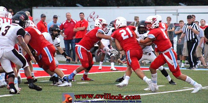 | Defender Carter Lowe (#25) and the intended East Central receiver both had their hands on this pass but Carter wrestled it away and reached the EC 40 setting up Collinsville for another score before halftime. Seth Weiser kicked a field goal with 50 seconds left (4th and goal from the 10) for a 29-0 half-time score. | |||||||||||||||||||
