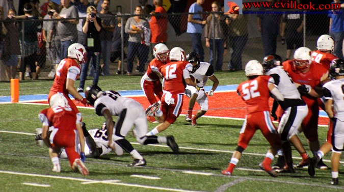 | Cole Dugger (#12) finished out the fourth quarter as quarterback and scored the 7th Collinsville touchdown from the 8 yard line. Can't say exactly what time it occured as the clock kept running (I assume by mutual coach agreement?). I think the score was with about a minute and a half left but there was only time for a kickoff before there were zeros on the clock and a 47-0 win. -- Ted | |||||||||||||||||||