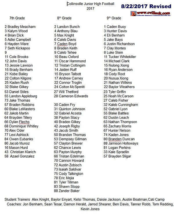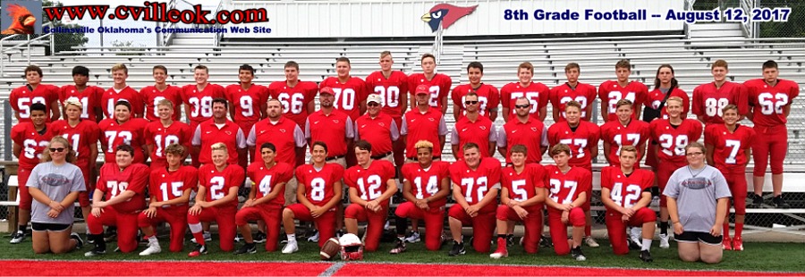 Carney (17), Cameron Edwards (28), and Caden Boyd (7). -- Back Row: Brandon Thomas (50), Quinton Johnson (31), Braden Gilkey (40), Caleb Davis (6), Payton Stacy (38), Caleb Tehee (9), Tristan Edelman (66), Cannon Howard (70), Caden Fry (30), Connor Troglin (22), Dempsey Gillman (53), Cody Talkington (75), Gabriel Acosta (32), Colton McSperitt (24), Shawn Stopp (83), Zander Baker (88), and Chance Lewis (62). |