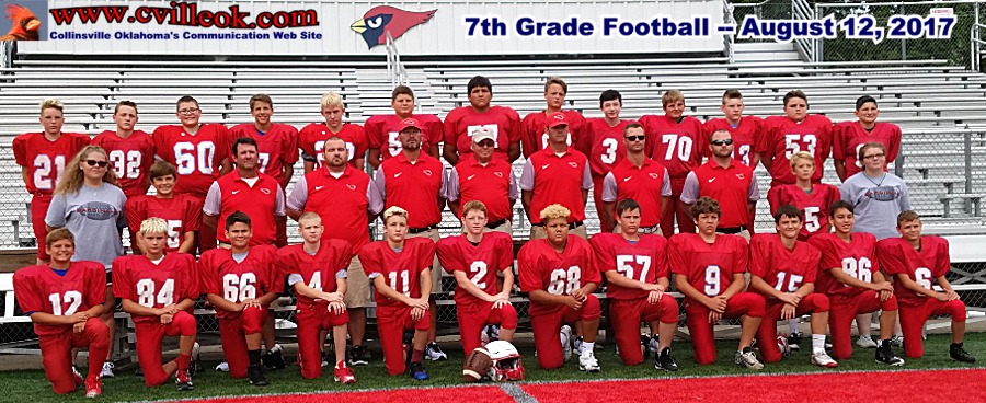 | 2017 Seventh Grade Football (L-R) -- Front Row: John Davis (12), Owen Eubanks (84), Dylan Flechs (66), Brian Dick (4), Cole Brooks (11), Bradley Meacham (2), Dominique Whitley (68), Braden Robbins (57), Jake Thomas (9). Bradey Benham (15), Jacob Munoz (68), and Hayden Ware (6). -- MIddle Row: Kelsi Thomas, Kaden Rush (25), Coach Jon Benham, Coach Jarrod Shearer, Coach Damon Herald, Coach Tom Redding, Coach Ben Davis, Coach Sean Tesar, Coach Tanner Robb, Adlei Campbell (5), and Daisy Jackson. -- Back Row: Kobe Bailey (21), Blake Gilkey (32), Blake McMasters (60), Seth Kickapoo (7), Colton Kilgore (22), Landon Appleburg (55), Jacob Martin (62), Kalym Wood (3), Alex Oder (70), Jessie Lawson (13), Jake Thomas (53), and Braden Tillery (64). | |||||||||||||