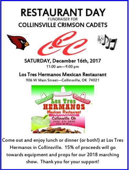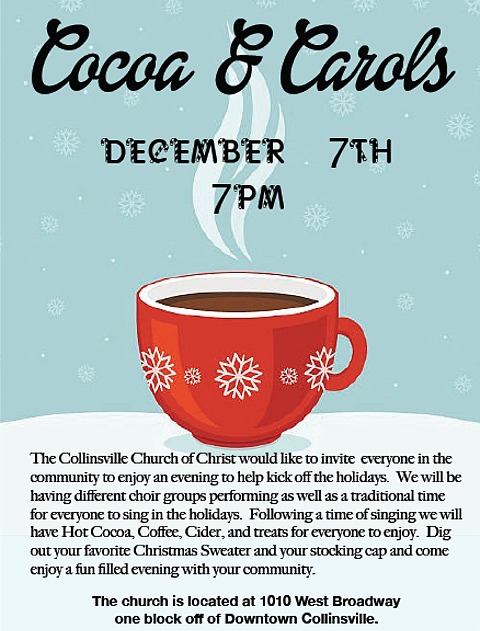 Dec. 8CHS Girls Basketball at Bixby Tourn. (2pm Deek Creek or Glendale) tba CHS Wrestling at Enid Tournament 7pm Collinsville Hometown Christmas at Crown Theatre |
