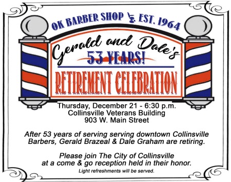Dec. 21No School 9-noon Girls Basketball Camp at CUE. 2nd to 6th grade girls. Dribbling & shooting skills. $25 6:30pm OK Barber Shop Retirement Celebration at Veterans Building -- photos |