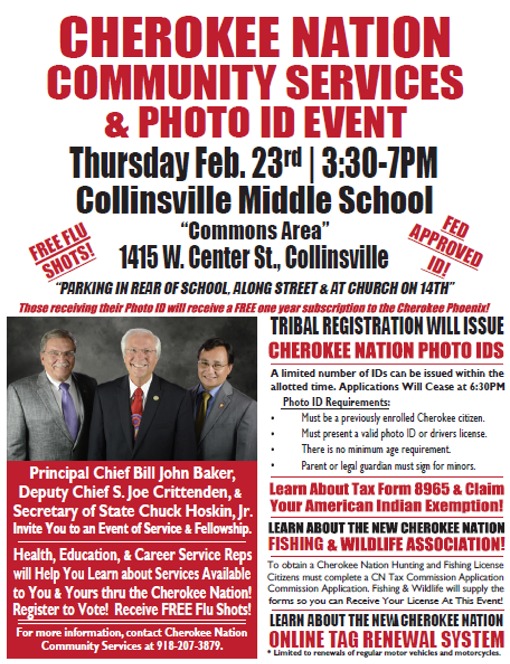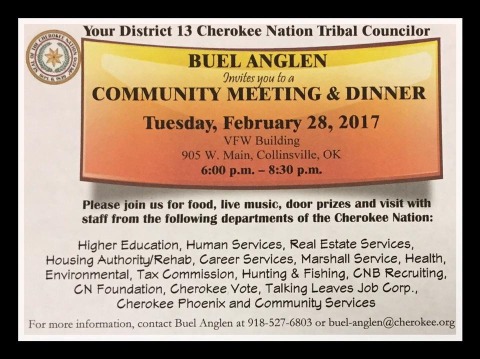 Feb. 14Valentine's Day 4/5/6/7:30pm CHS Basketball here -vs- Claremore 4pm CHS Baseball Var Scrimmage at Jenks 4:30pm JV-Red Baseball Scrimmage here -vs- Sand Springs (moved to Feb 17 at SS) 6:30pm Victory Cherokee Organization at Community Building on North 12th 6:30pm Patchwork Quilters meet at Library 7pm Band Booster Meet at band room |