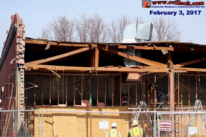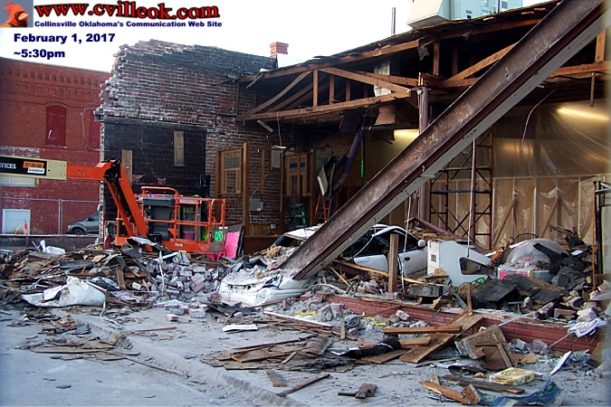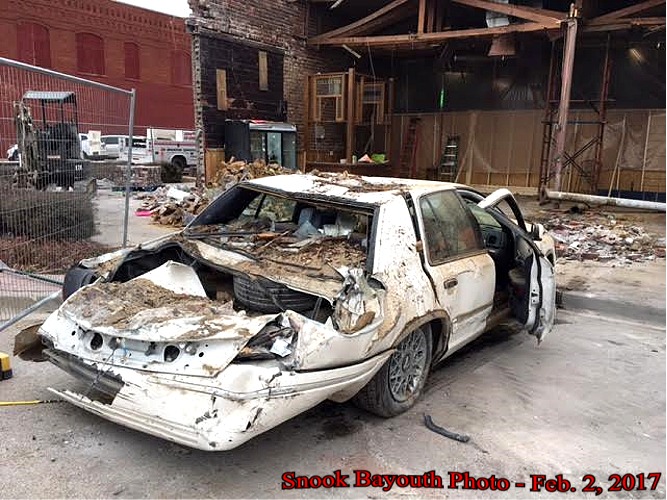 | Workers removed much of the debris from the collapsed front of Silver Dollar Cafe today revealing just how lucky the driver was with just a small gap between where the steel beam landed on the rear of his car ... and the large rooftop air conditioning unit which might have smashed the entire car if it had gone just a bit further taking out the 2nd support pole. -- Ted Wright -- 6pm Feb. 1, 2017 | ||||