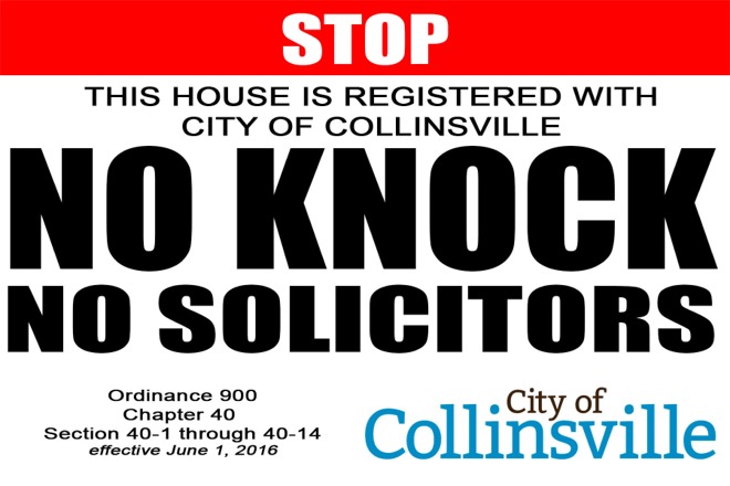 The City of Collinsville No Knock List Registration form is now online. By submitting this form, you are indicating your wish to have your address added to the Collinsville No Knock List of addresses that door-to-door vendors may not visit. Register on the City of Collinsville website at the link below: http://www.cityofcollinsville.com/No_Knock_List_Registration