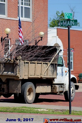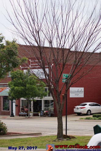 | This short stump is all that remains of Collinsville's tribute to the "OKC Survivor Tree". The tree that had flourished here since being planted in December 2008 had apparently not survived the latest Collinsville winter/spring. I first noticed the tree (on Main Street at 12th by City Hall) was leaveless May 27, 2017 (after most other trees were fully bloomed & green) and asked City Manager Pam Polk for comment. She indicated the tree was indeed "in trouble" and would likely not make it. The tree was removed June 9, 2017 (the day before Hogs N Hot Rods) along with the marker. Polk indicated the city might attempt to get a replacement but would want the soil tested first as the cause of the tree's demise was unknown. | ||||