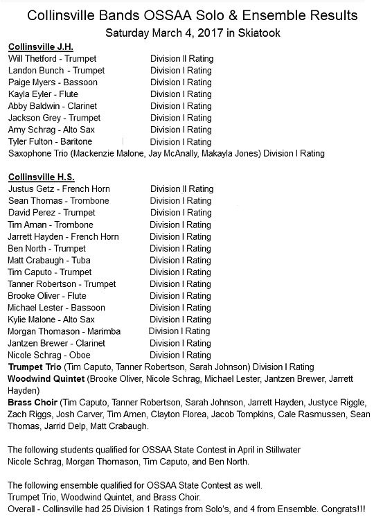 Sorry for the late post! First off, let me start by saying that Collinsville was represented with excellence yesterday! Their behavior while others were singing was professional and commendable! Proud of all their hard work! Scores will be posted by the following definitions: I Superior - Outstanding