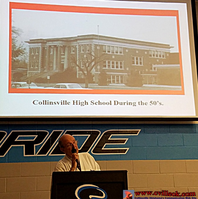 | Ron Evans presented a slide show comparing the city and high school activities of the 1950s (when the Nifty Fifties members graduated) to today's Collinsville and CHS. Collinsville's 3-story Central High School was built in 1912 and torn down in 1971. It was located on the block where the middle school is now. | ||||