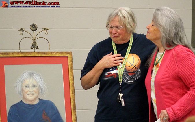 | Cindy Shannon was brought to tears by the surprise painting (by Elnora Herron, left) and presented by the Nifty Fifties group for Cindy's active support of the group and their activities for several years. | ||||