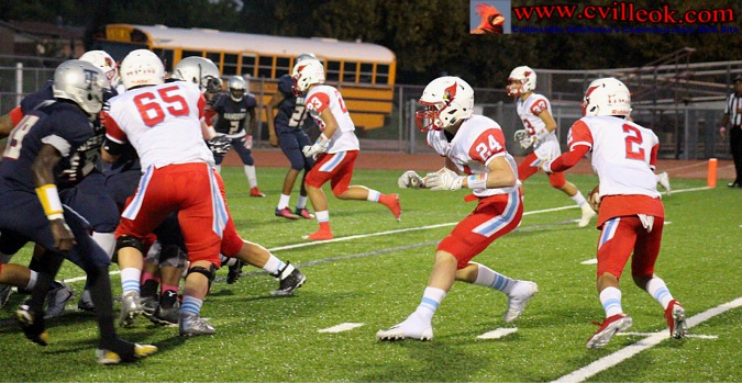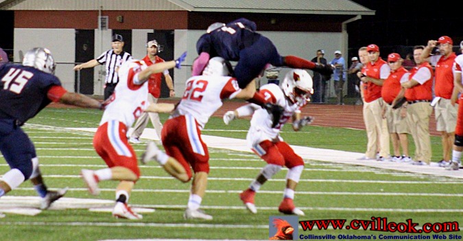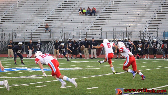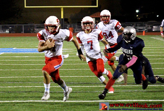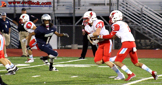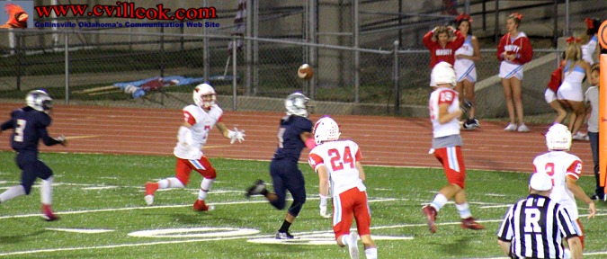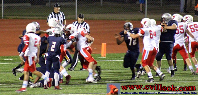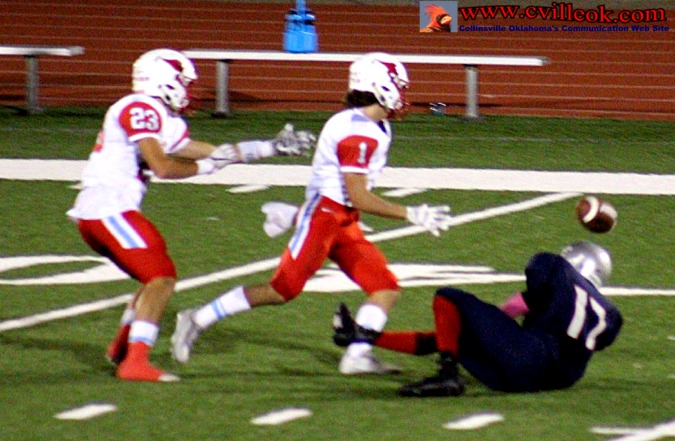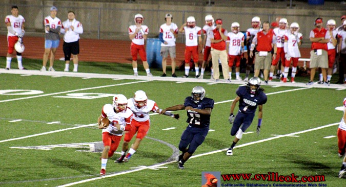| Hale connected on a long 2nd quarter pass in Collinsville territory but Colton Allphen (#1) knocked the ball loose, recovered and took off in the opposite direction (below). | ||||||||||||||||||||||