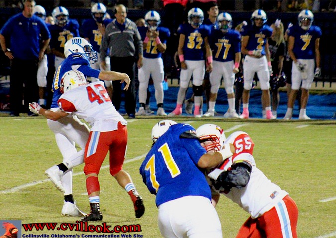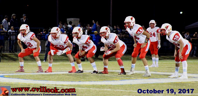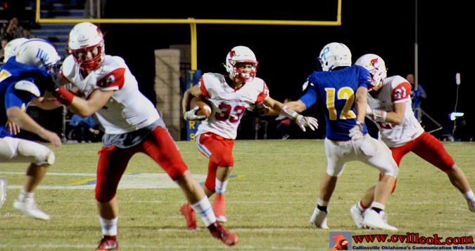 Collinsville held off a final Pryor rally which included two late 4th quarter touchdowns (2 yard run at 4:44 and 7 yard pass at 2:25) and the Cardinals fielding 2 onside kickoff attempts. Walker Roberts went high to grab this big hop on the final onside kick. Collinsville then gained one first down and ran out the clock for their 3rd district win (against 2 losses). Claremore and Skiatook remain on the regular season schedule. | ||||