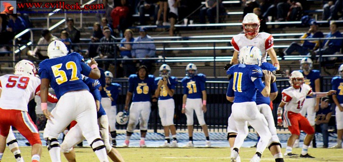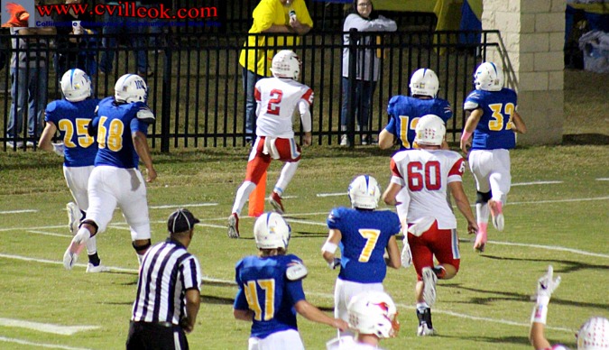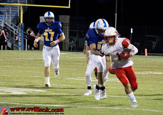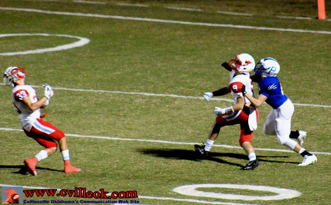 Pryor followed the initial Collinsville score with a lengthy drive (from their own 20 to the Cards 7) before Walker Roberts (#23) intercepted this Pryor pass with 5:01 left in the first quarter | ||||