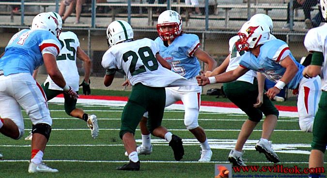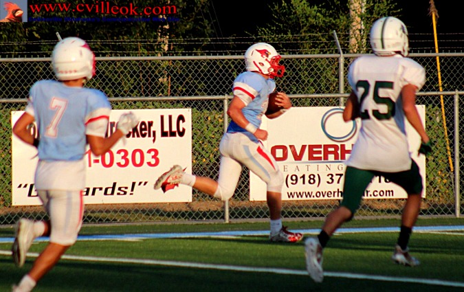 | Payton Russell (#36) scored a rushing touchdown with 5:51 left in the 2nd quarter and after a scrambling 2-point PAT the score was 22-0 in the JV contest with Catoosa here Monday. | ||||