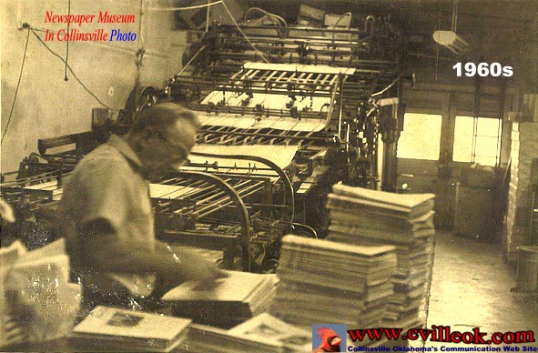John Wright (center) checking the print quality as issues of "The Collinsville News" roll off the large offset press (at 1108 W. Main in Collinsville) in the mid-1980's. The Wright family printed newspapers weekly on presses in Collinsville from May 11, 1899 to Feb. 12, 1986. The Wright newspaper was printed remotely in Nowata for about a year before it was sold in Feb. 1987 to Retherford Publications. |
