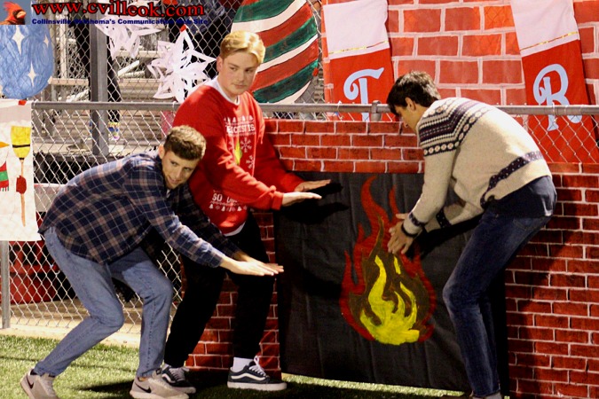 | Last week (round one -vs- Ada) heaters were necessary on the sidelines with temps in the twenties. This week was balmy by comparison (in the forties) but The Trap still brought the "heat" with a second Chrstmas theme. | |||||||||||||||||||||||||||||