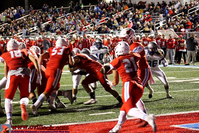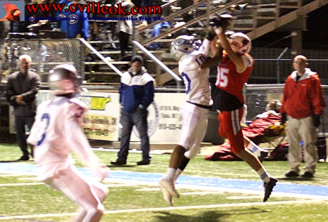 | Collinsville was this close to scoring just before the half with Baylor Haynie (#35) and the Guthrie defender both fighting for this Cole Dugger pass inside the five yard line. Neither came down with the ball with 6 seconds remaining in the first half that ended 7-3. | |||||||||||||||||||||||||||||