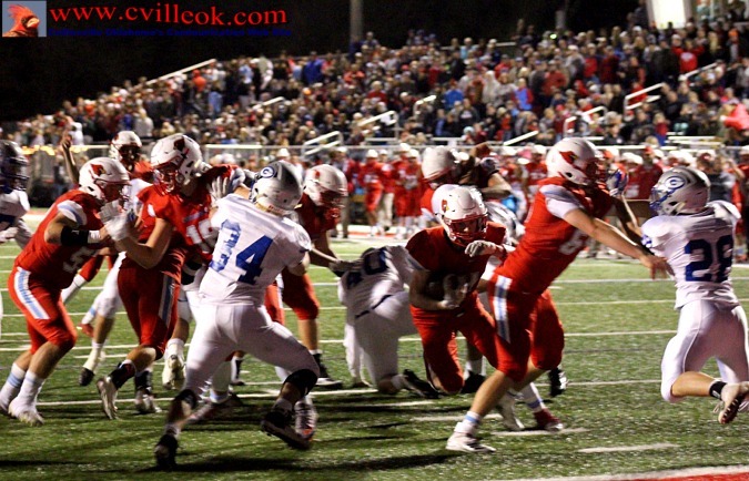 | Guthrie had the ball first and drove from their own 23 to Collinsville's 31 before the Cardinal defense turned them over on downs at the 35. Starting from there Collinsville gave Guthrie a big dose of Brayden Burd (#22) as he carried the ball ten straight times to cover 65 yards for Collinsville's first touchdown (below) at 3:31 in the first quarter. Seth Weiser kicked the extra point and the score was 7-0. | |||||||||||||||||||||||||||||