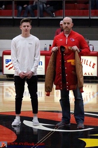 | Matthew Budnik received his All-State jacket from Coach Eric Dutton during half-time of the boys basketball game. Matthew earned his jacket with a top 10 finish at Cross Country State back in October 2018. | ||||