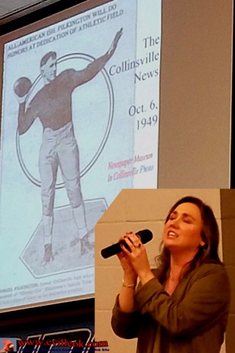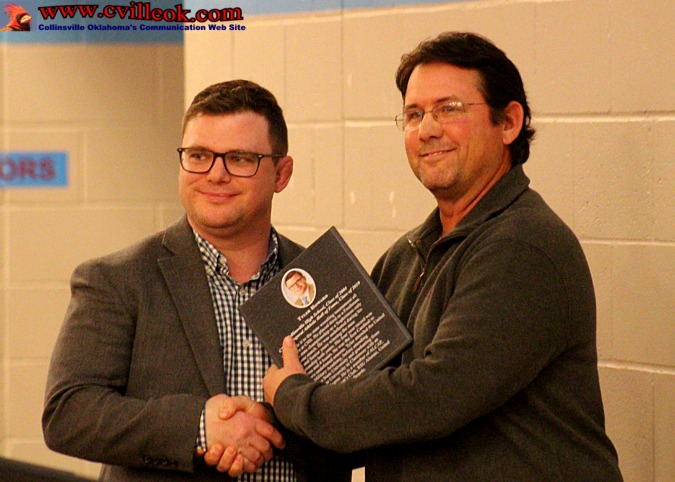 | Ron Evans spoke on behalf of Dr. Oliver Hodge (deceased), a 1921 Collinsville HS graduate, who coached at Collinsville and Tulsa University before becoming the Oklahoma State Superintendent of Schools. His Collinsville Athletic Hall of Fame plaque (above) will be hung in the Oklahoma State Education building in Oklahoma City that bears his name. Each member of the Hall of Fame will have a plaque placed at Collinsville High School. | |||||||||||||||