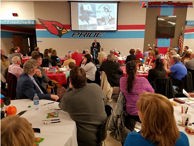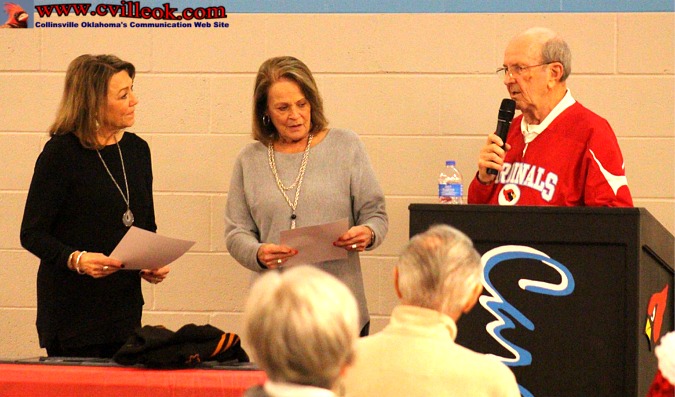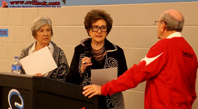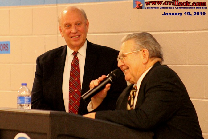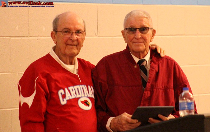 | Ron Evans introduced his uncle, Jerry Evans (left), who starred in football and basketball at Collinsville before becoming one of Tulsa University's leading basketball scorers. Jerry was Collinsville's first All-State basketball player. He led his 1953 CHS team to a 25-2 record which still stands as the school's record. He was later an assistant coach at TU and then started the basketball program at Oklahoma Military Academy (now RSU). | |||||||||||||||