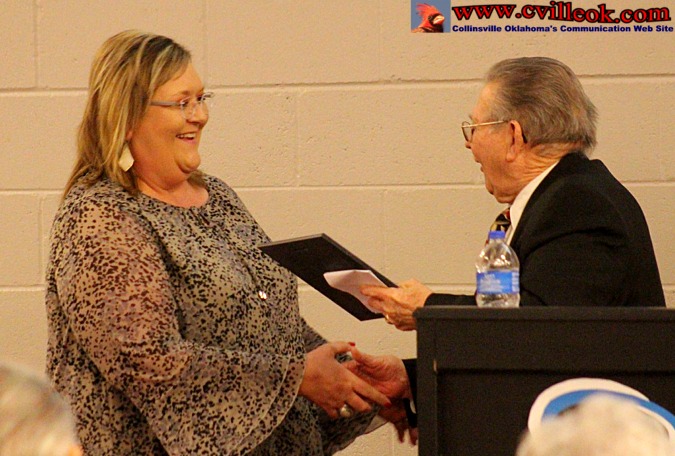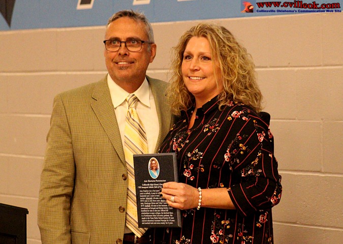 | Melanie Jones accepted her HOF plaque from her former CHS coach Howard Ray. Melanie played softball, basketball and volleyball at Collinsville. She made All-State in basketball in 1983 and was the leading scorer in the state of Oklahoma with a 45.1 average. She later coached track and basketball. In 1995 she became District Administrator of the Amarillo (Texas) Schools and continues in that position. | |||||||||||||||