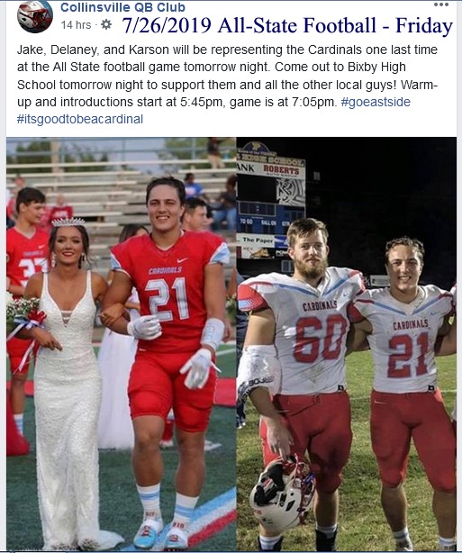 ![]() Jake Tuttle, Karson Cole & Delaney Cottingim participated in the 2019 All-State Football activities July 26. Jake scored two touchdowns. |