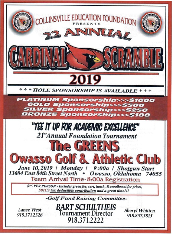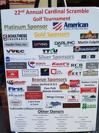 | Another successful golf tournament is in the books. Thanks to all the golfers who participated. And we'd like to recognize our Platinum hole sponsors today. They are American Bank of Oklahoma and Brewer Construction. A HUGE thanks to these awesome companies for their support at the highest level! -- Collinsville Edication Foundation | ||||||