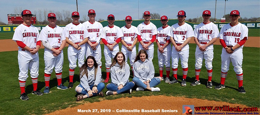 2019 CHS Baseball Seniors: (Standing L-R): Cobey Gorrell (12), Kenlee Hall (20), Ethan Wickman (15), Hayden Minton (5), Trinton Klemme (22), Brett Trimble (16), Jordan Wilkins (13), Colby Davis (14), Cale Hutchens (2), Josh Wise (8), & Colton Rabbitt (19).-- Trainers (Seated L-R): Bailey Nunes, Gracie Oxford & Jorunn Aedatti. | ||||||