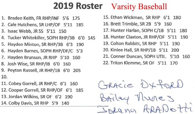 2019 JV White Baseball: I don't have a roster and can't see any numbers.-- Ted -- Any help appreciated: wrightted@aol.com | ||||||