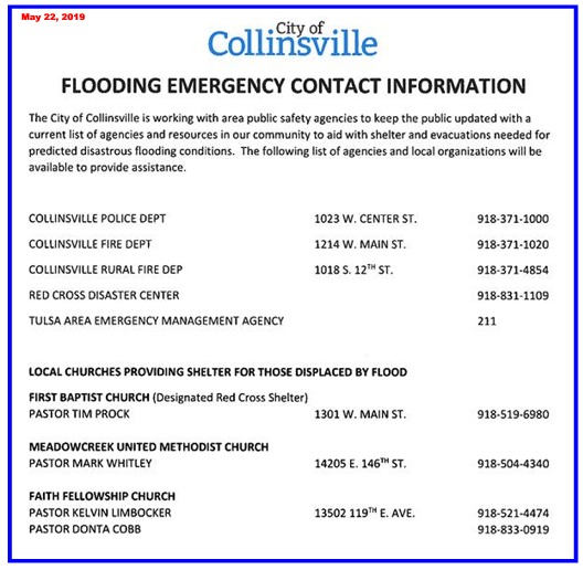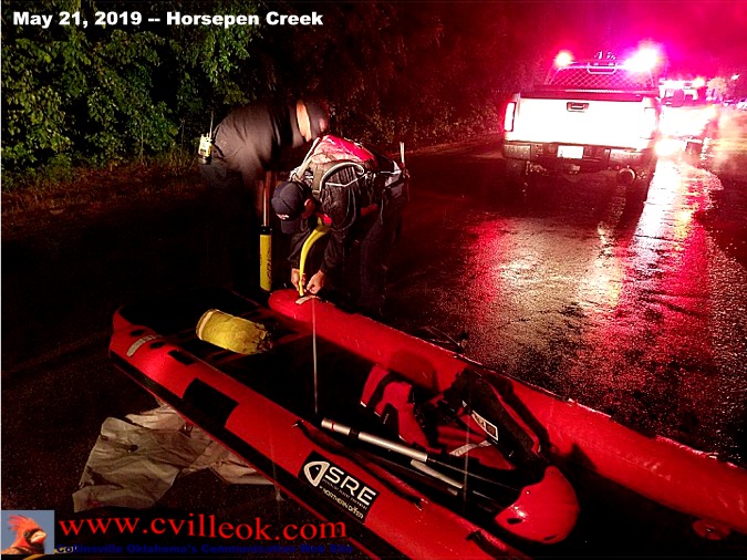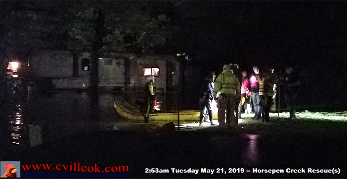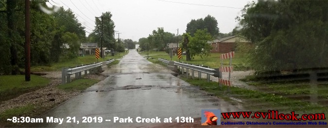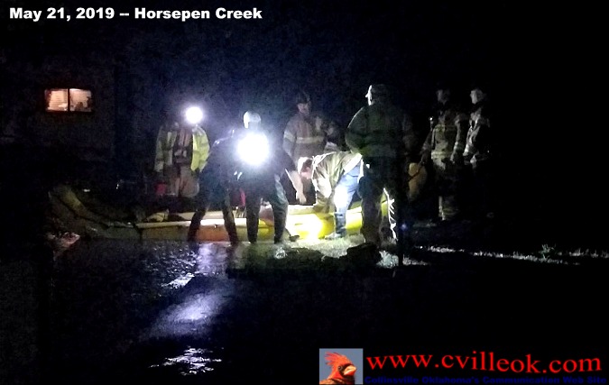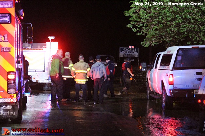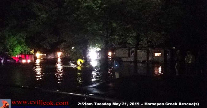 Collinsville city and rural firefighters (with an assist from several local communities with inflatable rescue boats) evacuated about 25 residents from Collinsville's Horsepen Creek Mobile Home Park (on north 19th Street) between 2am and 3am Tuesday May 21 as the creek water rose quickly and trapped them in their home. There were no injuries, but many suffered flooding in their homes and vehicles. | |||||
