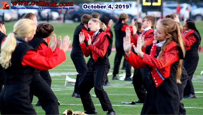 Memorial's Homecoming ceremonies at half-time forced the Collinsville Band to perform pre-game at LaFortune Stadium in Tulsa Friday evening. The band will be at the Broken Arrow Marching Contest Saturday. They won their class at the Owasso Contest last week. | ||||||||||||||||||||||||