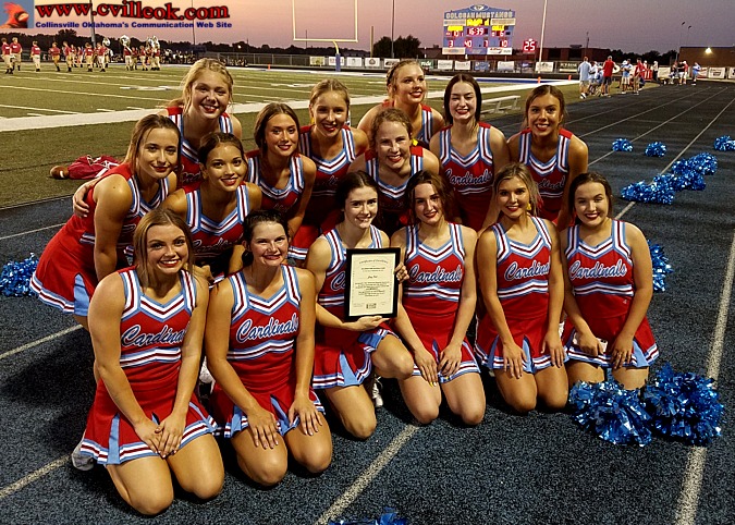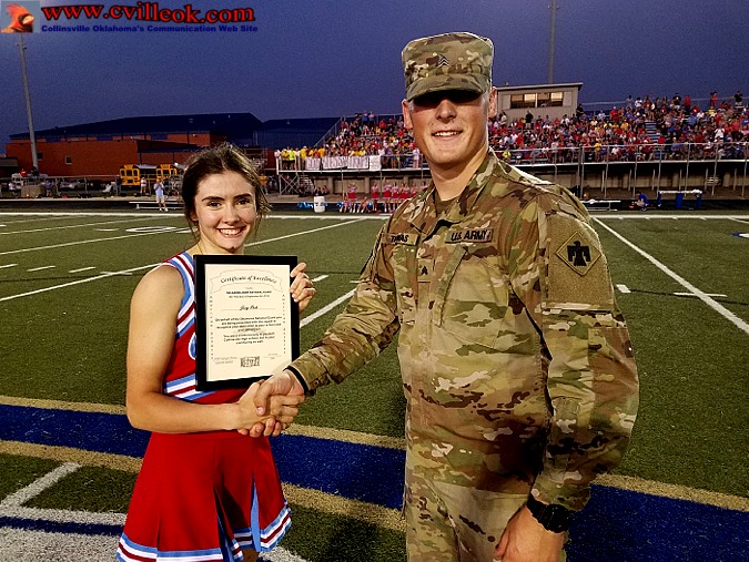 | Jacy Rule (Collinsville cheerleading and volleyball senior) received a "Certificate of Excellence" from the Oklahoma National Guard as Collinsville's Student of the Month. Collinsville's Teacher of the Year, Christina Vogel, also received recognition at a half-time ceremony (along with Oologah's student and teacher). | ||||||||||||||||||||||||||||
