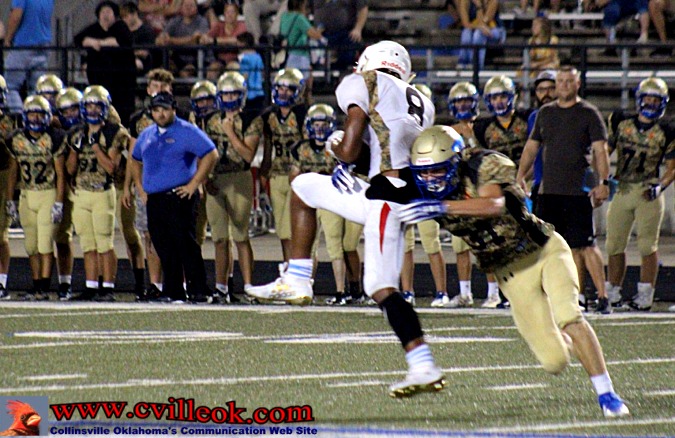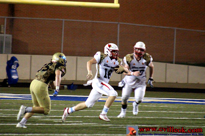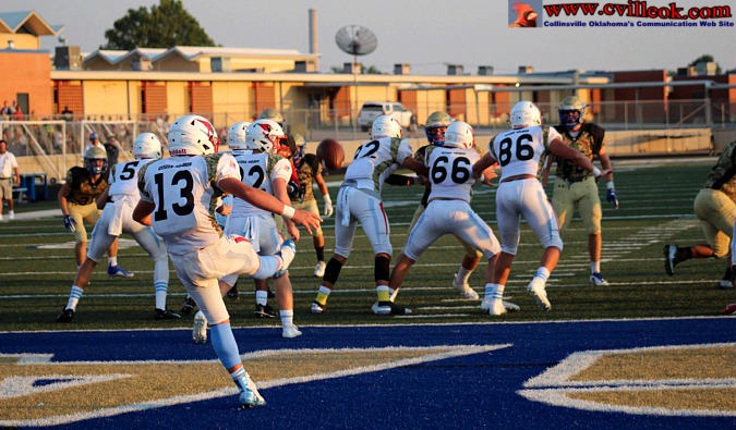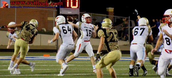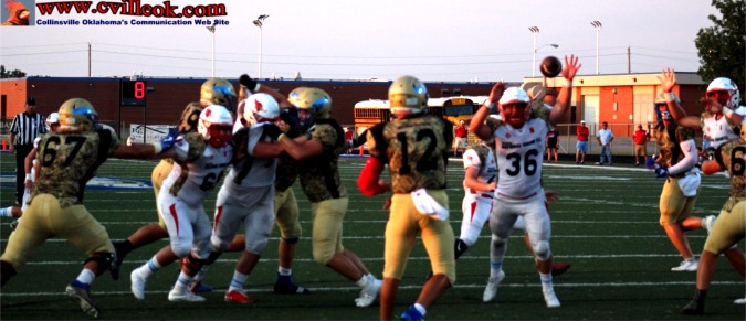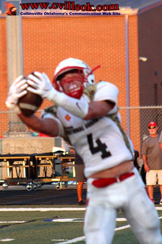 | Collinsville came close to scoring on this Weathers to Taylor Olinghouse (#20) pass, but it was tipped up and interceptd by Oologah near the 5 yard line with 2:38 left in the 3rd quarter. | ||||||||||||||||||||||||||||