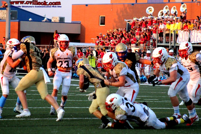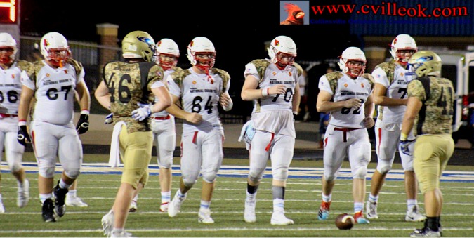 | Oologah drove 80 yards for their only touchdown but the Cardinal defense made the final yard difficult with stops at the 1 yard line, ~2 foot and 1 foot marks, before the Mustangs finally reached the end zone with 2:07 left in the 2nd quarter. Oologah kicked their extra point for a 0-10 score. | ||||||||||||||||||||||||||||