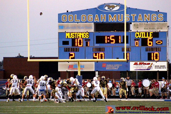 | Jake Bays punted from the endzone out to the 30 setting Oologah up with a short field for the first Mustang field goal with 2:43 left in the first quarter. | ||||||||||||||||||||||||||||