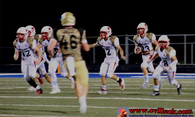| Caden Buoy (#4) was in at quarterback for a few plays (after returning Oologah's kickoff to the 33 yard line). On his first play from scrimmage he tracked down a fumbled snap and scrambled for 4 yards out to the 37 but got flipped upside down on the tackle. | ||||||||||||||||||||||||||||