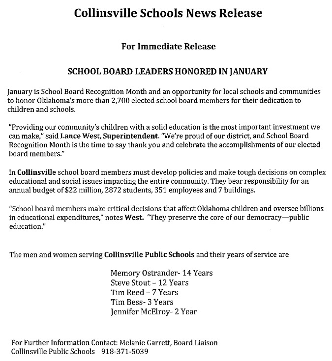 the Education Service Center, 1902 W Maple, Collinsville, OK 74021.