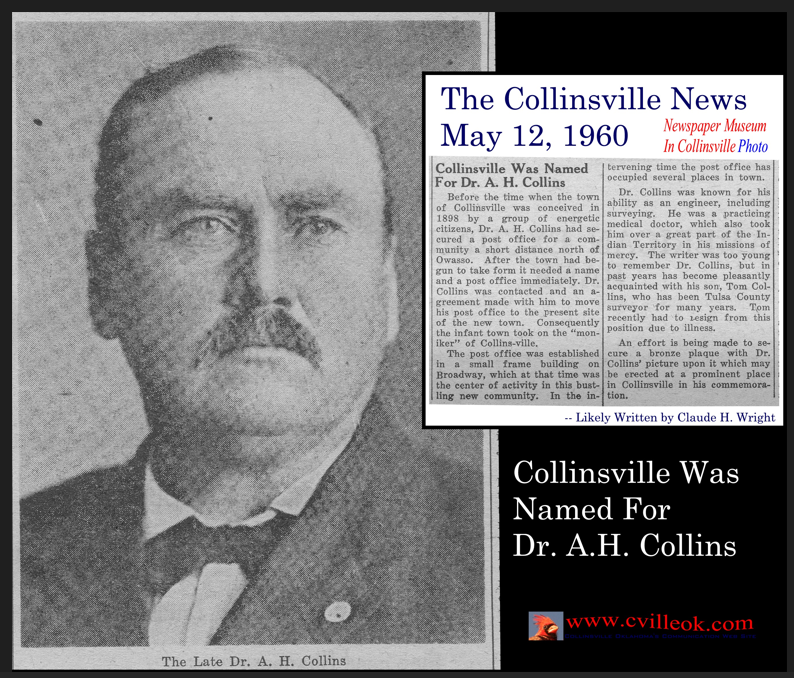 | Collinsville named for Dr. A. H. Collins to move his post office here in ~1898 |