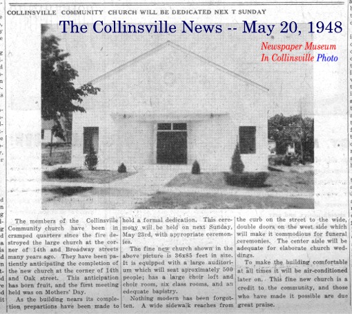 The church began with a group of women from three Collinsville churches (Christian, Presbyterian, and Methodist) who saw a need of a non-denominational church in Collinsville. In a town of less than 2,000 people, there were eight churches, each seemimg to have a struggle to keep and adequately support a full-time minister.