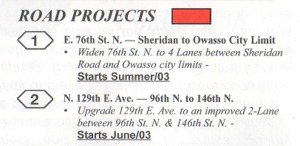 According to the June 2003 Tulsa County Board of Commissioners' Newsletter, work should begin soon on improvements to 129th E. Ave. (1/2 mile west of Highway 169) between Owasso and Collinsville. The other District 1 road project will widen 76th St N. to 4 lanes between Owasso and Sheridan Road. Wilbert Collins is the District 1 County Commissioner.