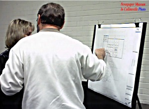 Assistant Superintendent Craig Cheech explained the details of the planned construction if voter approve the bonds above. The most significant would be construction of a building on the north portion of the middle school block. It would replace the existing cafeteria and Media Center. It would provide more classrooms, an enlarged library and a commons area. The new building would connect to the existing main building. The annex building (formerly Central Grade School) next to Spring Street would eventually be demolished and portions of the arches would be used on the new building to preserve a sense of the history of this block which has served the Collinsville Schools since at least 1909.