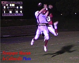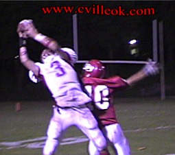 Ricky Rimpley (#3 above) caught this Tyler Whitaker pass at the Grove 17 yard line with 26 seconds left in the game. The next play was an incompletion to Rimpley (below) with 21 seconds left. The Grove Ridgerunners intercepted the next Collinsville pass in the endzone with 12 seconds left and had the shutout as well as their first win of the season. |